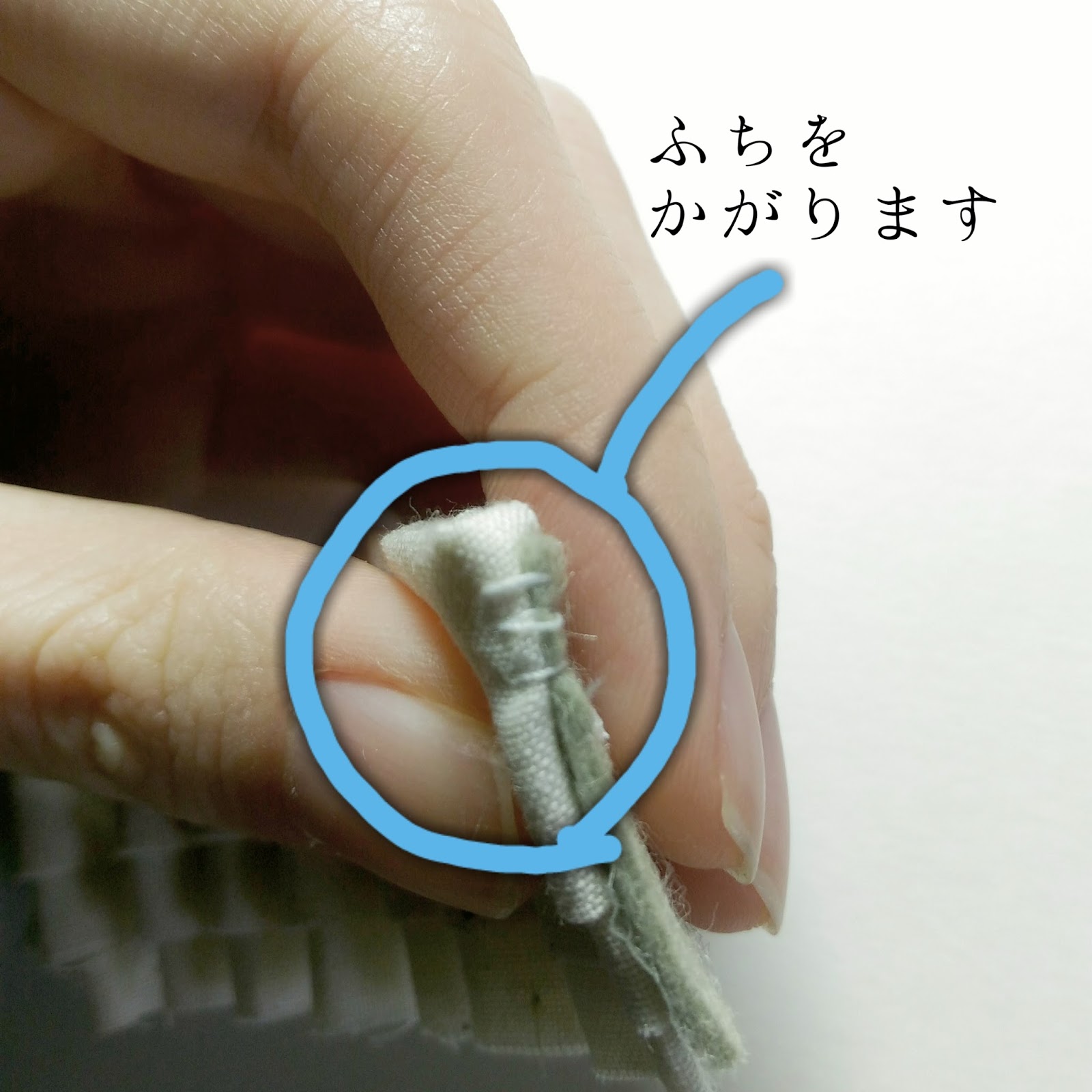 ⑩ふちをかがりながらフェルトに縫い付けます。反対側のふちも同様にかがります。