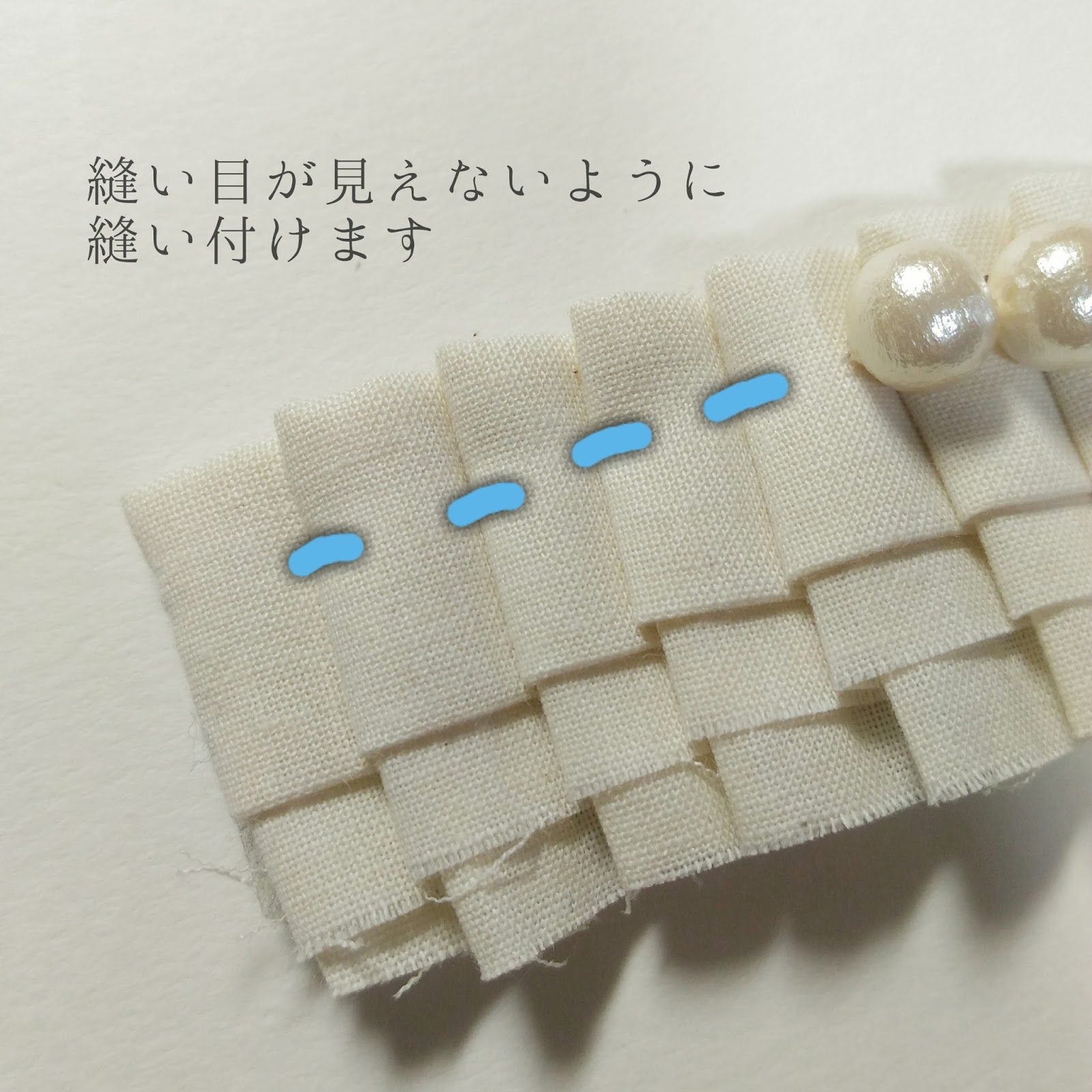 ⑫ビーズをつけない部分も、ひだの部分を縫い目が見えないようにフェルトに縫い付けます。