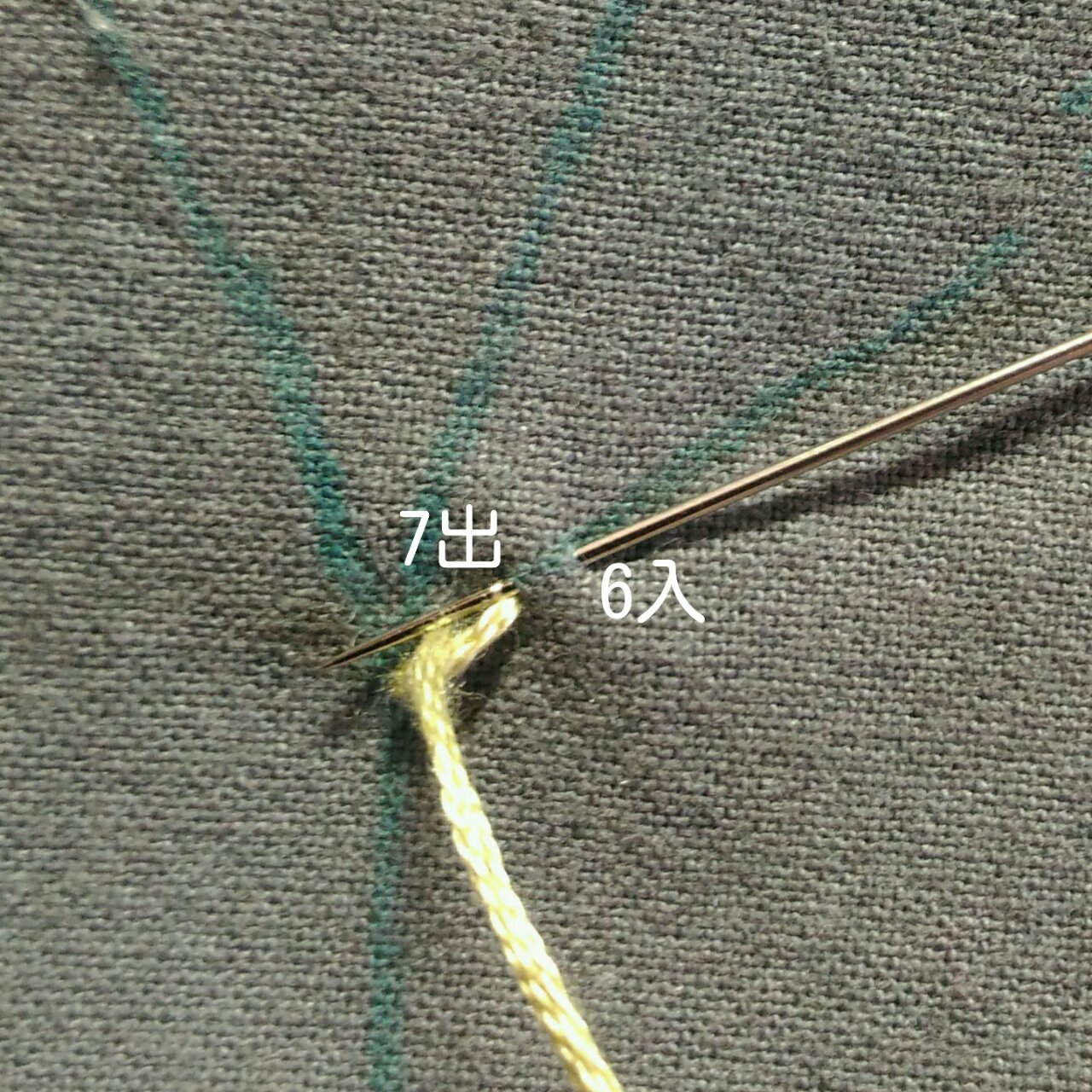 ③同じように5mmほど進んだところに針を入れ(6)、1つ前の針の穴から出します(7)。