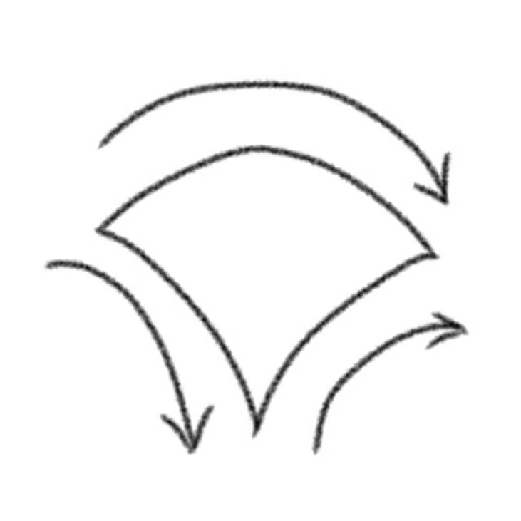 この図のような扇形を縫うとしたら、矢印の方向へ進むようにします。この扇型、なんの絵やねんということはおいといて。