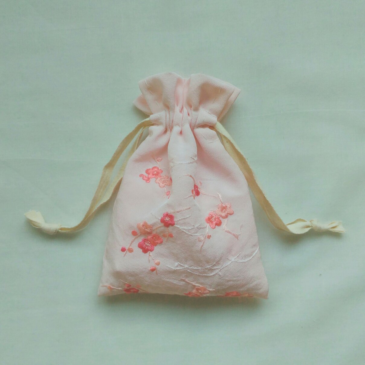 刺繍の半衿をリメイクして巾着袋を作りました。