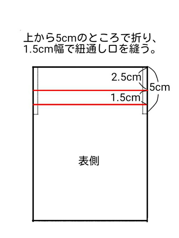 ⑤上から5cmのところで折り、1.5cm幅で紐通しを縫います。反対側も同様に縫います。