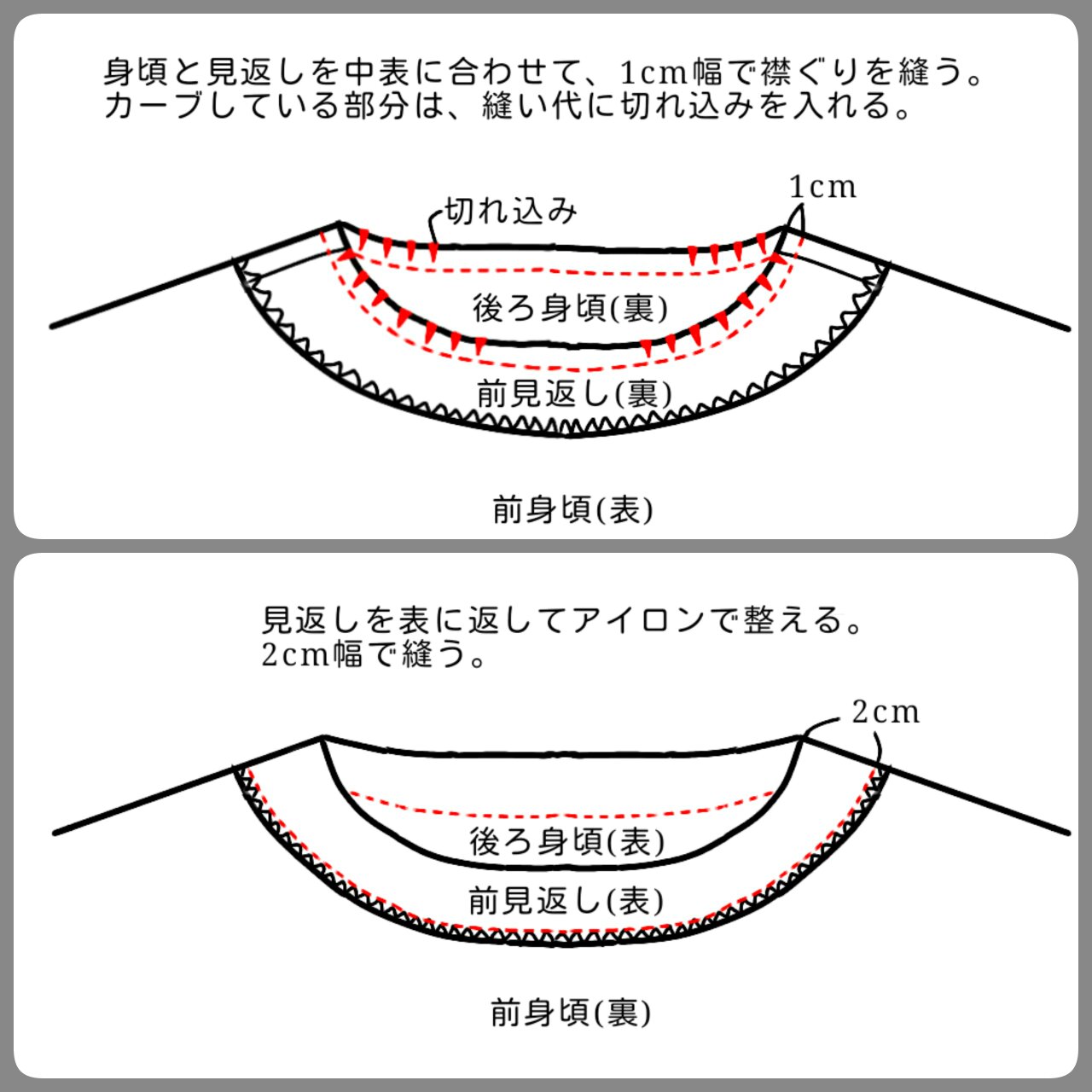 ⑤襟ぐりに見返しを中表に合わせて縫う。縫い代に切り込みを入れて、表に返してアイロンで整える。2cm幅で縫う。★見返しをつける前に、頭が通るか確認してください。きつい場合は幅を広げます。