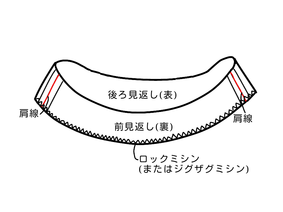 ④前・後ろ見返しを中表に合わせて、肩線を縫い、縫い代を割る。下側一周ロックミシンをかける。