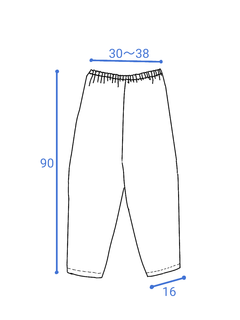 縫い代込みの寸法です(ウエスト3cm、裾2cm、その他1cm)