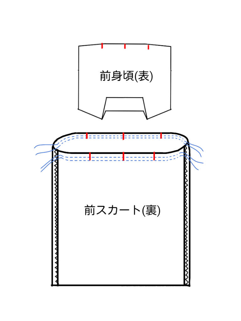 ⑦スカートと身頃のウエストラインをそれぞれ四等分して印を3つつける。スカートの縫い代に2本、粗ミシン(針目4mm程度)をかける。