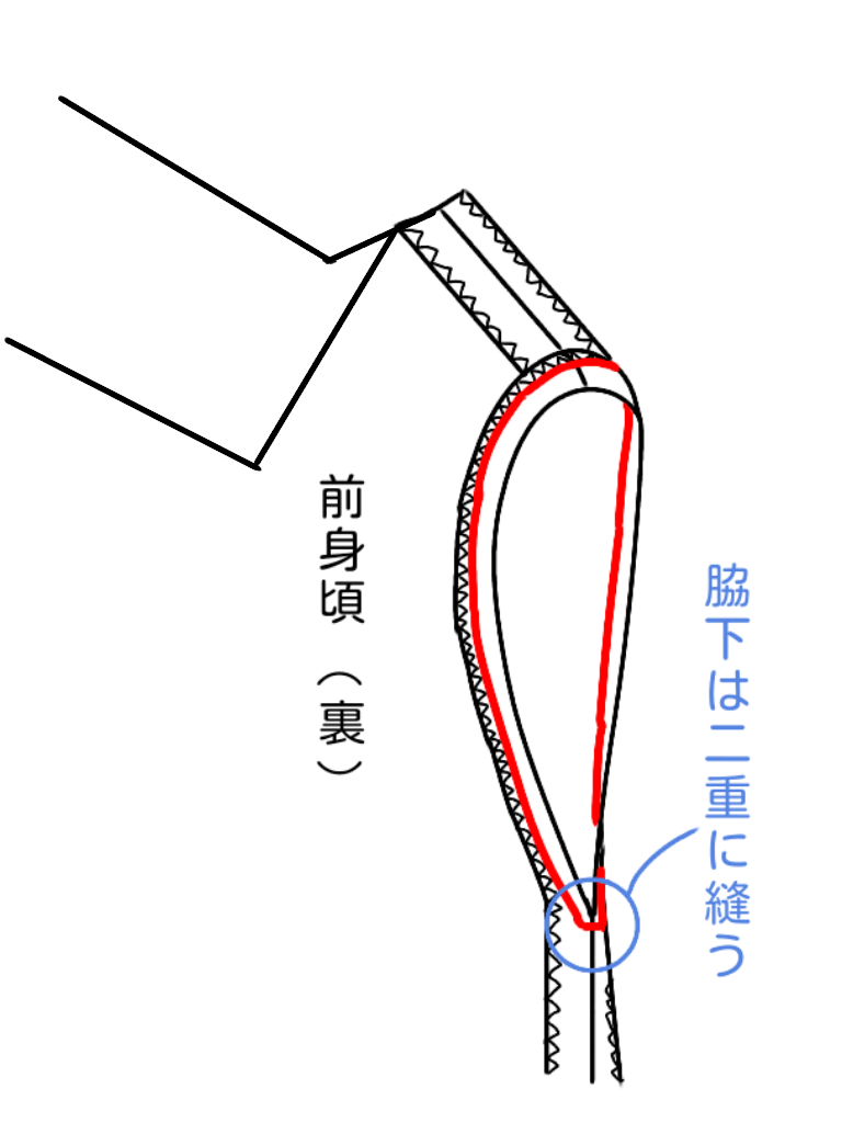 袖口を1cm折って端にミシンをかける。脇下は二重に縫う。