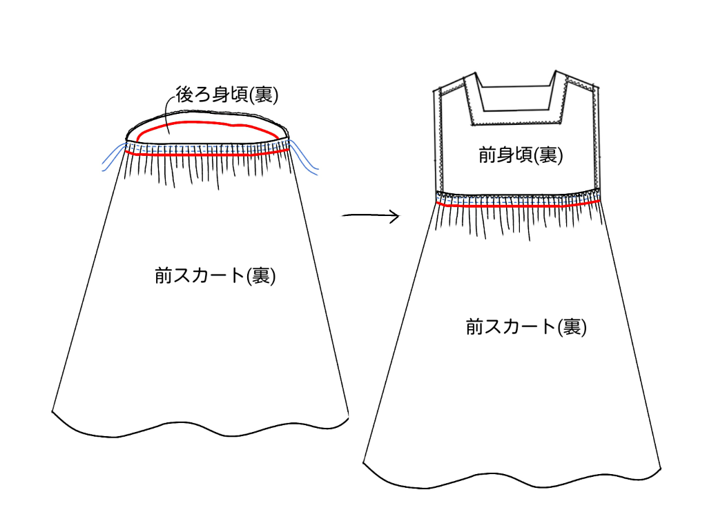 ⑧スカートと身頃を中表に、印を合わせて待ち針を留める。均等にギャザーを寄せる。針目を戻して(針目2~2.5mm)出来上がり線で縫い合わせる。2枚一緒にロックミシンをかけ、縫い代は上に倒してアイロンをかける。