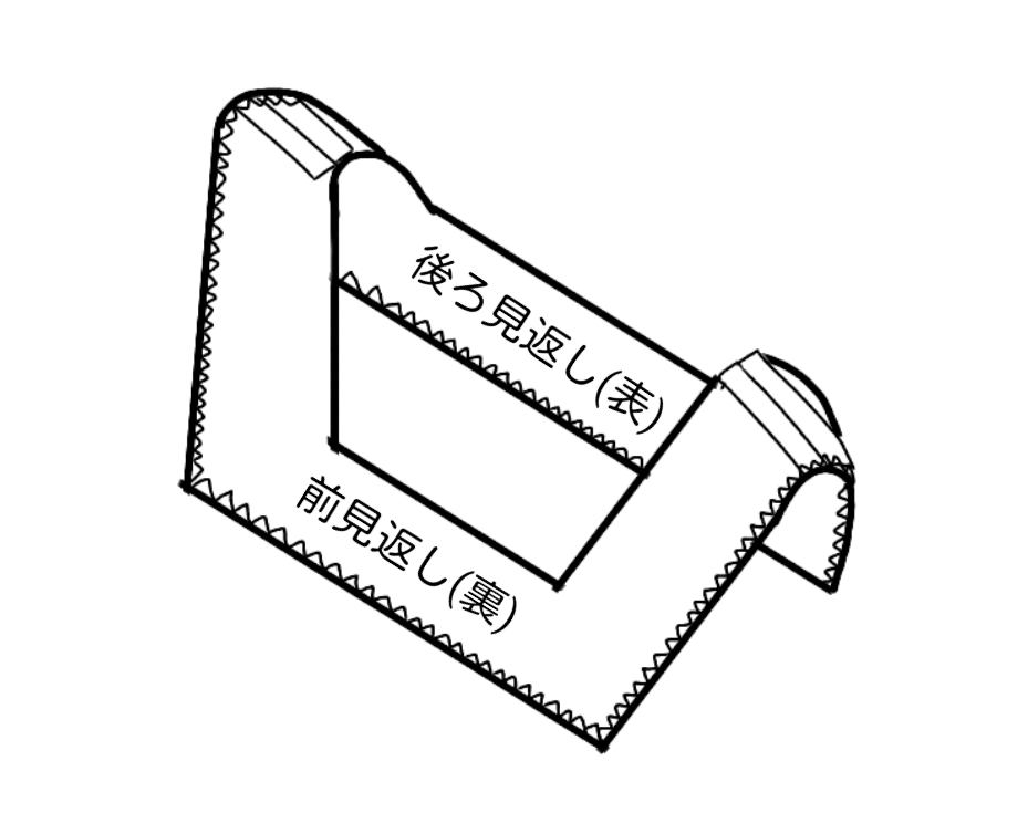 ④前・後ろ見返しを中表に合わせて、肩線を縫い、縫い代を割る。下側一周ロックミシンをかける。