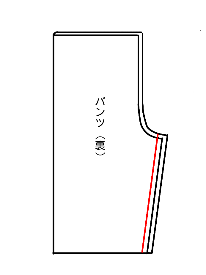 ①股下を縫う(縫い代1cm)。2枚一緒にロックミシン(またはジグザグミシン)。もう片方も同様に。