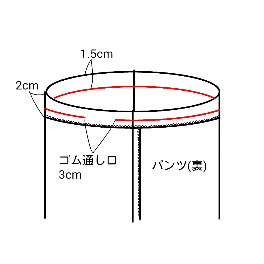 ゴム(ウエスト寸法+ゆとり1cm+2cm)を通して2cm重ねて縫い止めて、ゴム通し口を縫い閉じる。