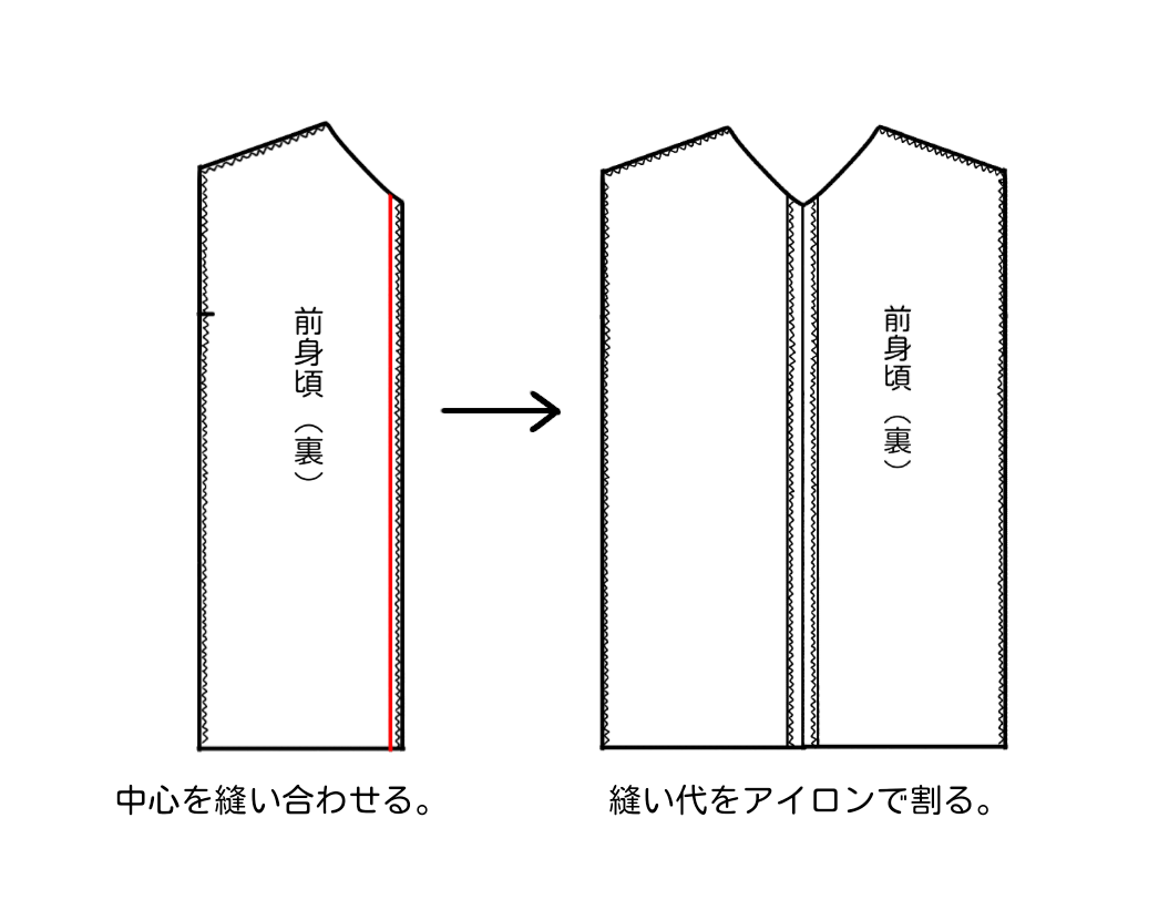 ②前身頃の前中心を縫い合わせる。縫い代をアイロンで割る。後ろ身頃も同様に。