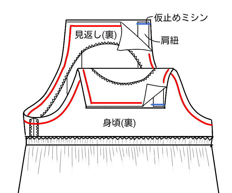 ⑩身頃に肩紐を仮止めする。肩紐を挟んで身頃に見返しを中表に合わせて縫う。