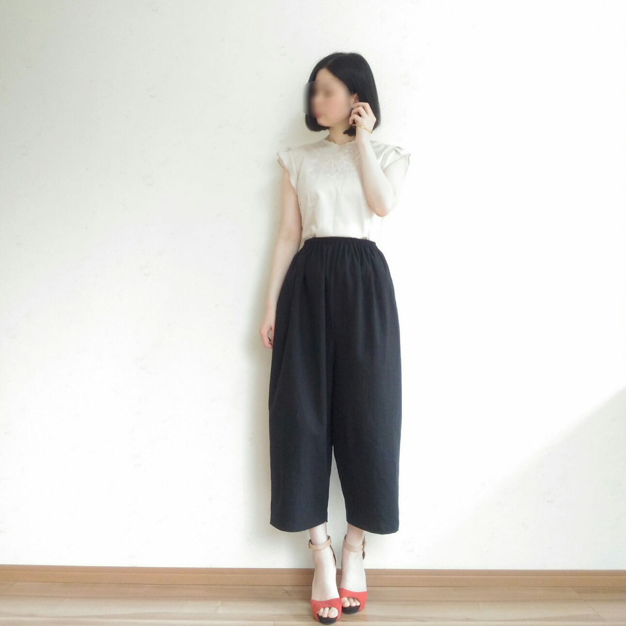 フリル袖のブラウスとサンダルにも合わせてみました。裾をインするのもいいと思います。