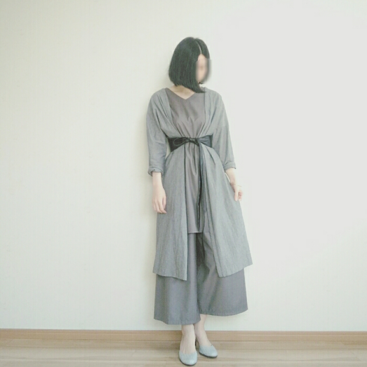 今回は中の服もグレーを選び、ワントーンでまとめてコートの上からサッシュベルトをしてみました。