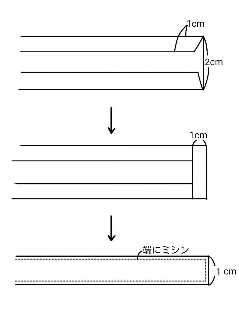 ④アイロンでリボンの折り目を付け、端をミシンで縫う。4本同様に作る。