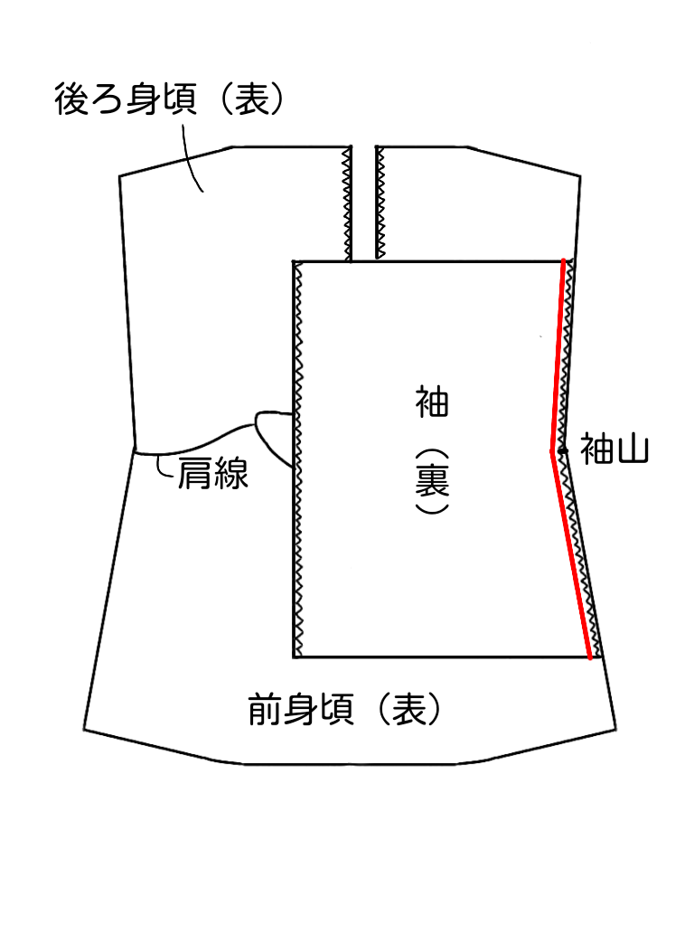 ③袖と身頃を中表に合わせて縫う(袖山の印と肩線を合わせる)。2枚一緒にロックミシンをかけて、アイロンで縫い代を袖側に倒す。