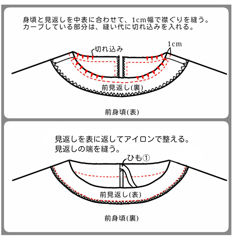 ⑦襟ぐりに見返しを中表に合わせて縫い、縫い代に切り込みを入れる。表に返してアイロンで整え、2cm幅で縫う。