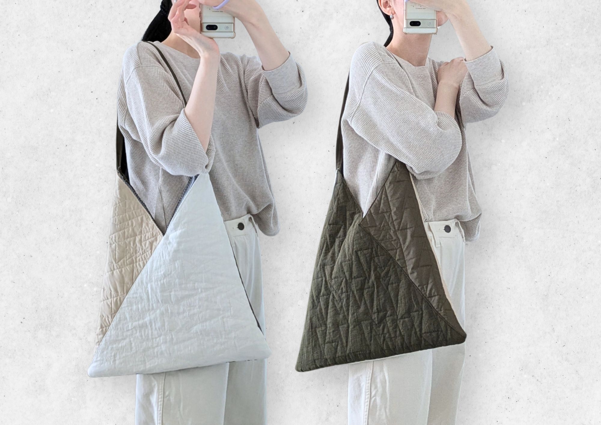 これね、一つのバッグなんです。反対側が違う色になるように作ったので、服に合わせて表に見せる側面を変えられます♡