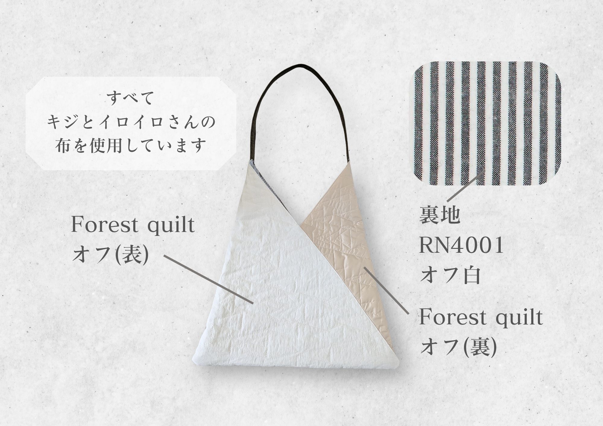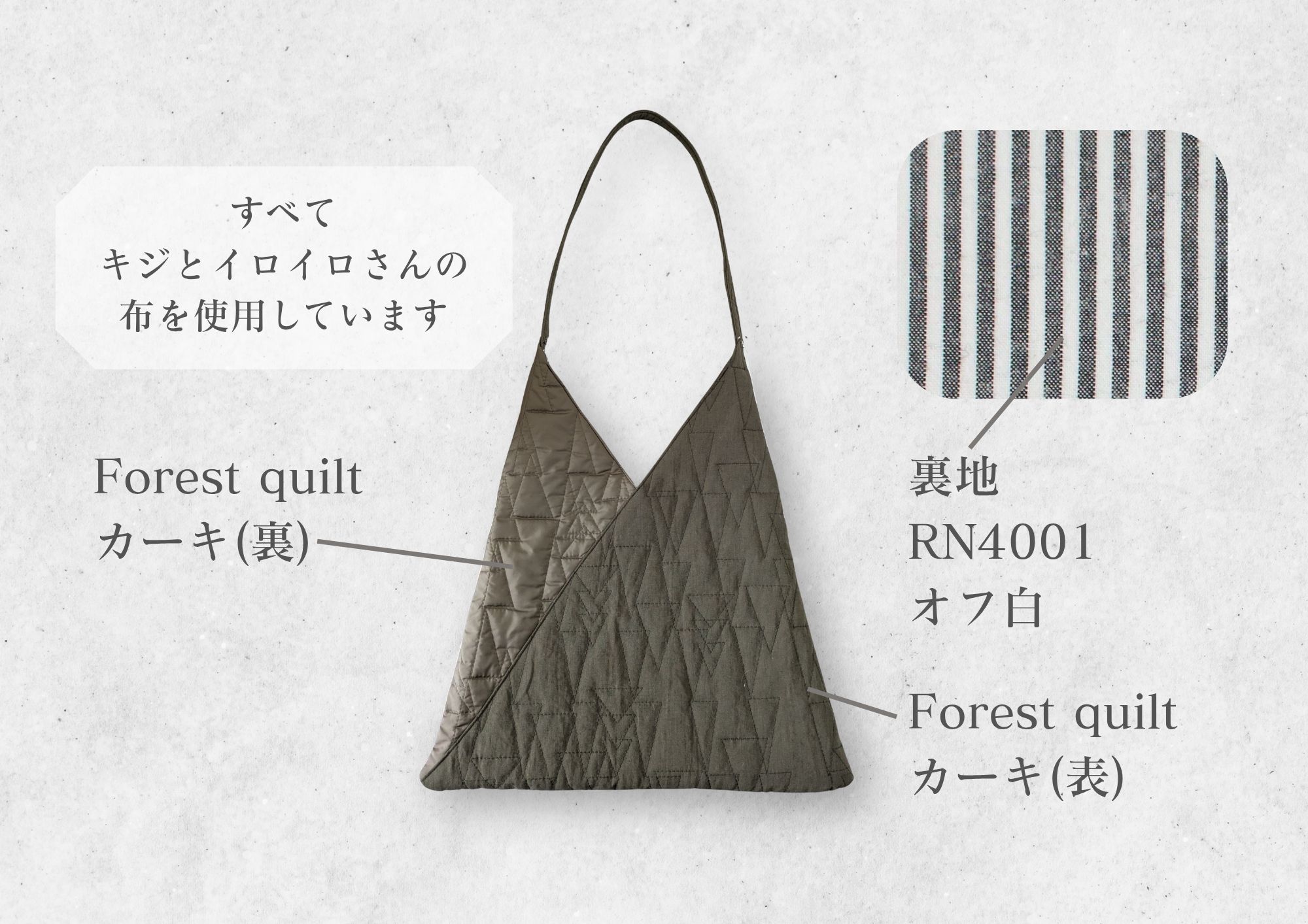 Forest Quiltは、抽象的な木々の模様のキルト生地でとてもおしゃれ。表裏で質感が違うので今回は両方使ってみました!ふっくらとして厚みがあるので、丈夫なバッグに仕上がりました(ˆˆ)