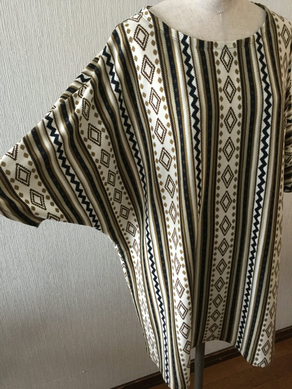 ドルマンスリーブTシャツの全長を75㎝にし、裾も少し拡げてアイヌ文様のようなニット地を使ってつくりました。チュニックのようになって、色々な着用アレンジができそうです。